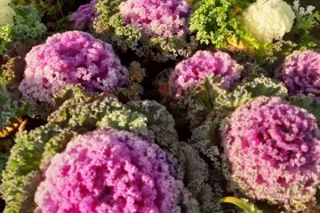 Довідка. Розеточна капуста має яскраве біло-фіолетове листя та не боїться морозів. Навіть якщо дощова погода в столиці зміниться легкими осінніми заморозками – вона вистоїть і буде квітнути. Між іншим, таку капусту можна сміливо висаджувати у дворах – вона стане окрасою зеленої зони. Рослина в залежності від видів починає квітнути ще влітку – у червні – та продовжує прикрашати клумби до холодів. Можна висаджувати різні сорти за певною схемою, і таким чином створювати різнокольорові клумби насичених кольорів і відтінків. А деякі сорти рослини дозволено вживати в їжу. Такі квіти, що є одночасно овочами, потрапили до нас з Японії та Північної Америки. Вони дуже люблять сонячне світло. Висаджують розсаду при заході сонця або в похмуру погоду. Важливо в кожну лунку додати по одній чайній ложці добрива. Для кращої адаптації молоді кущики слід притінити на 2-3 дні.